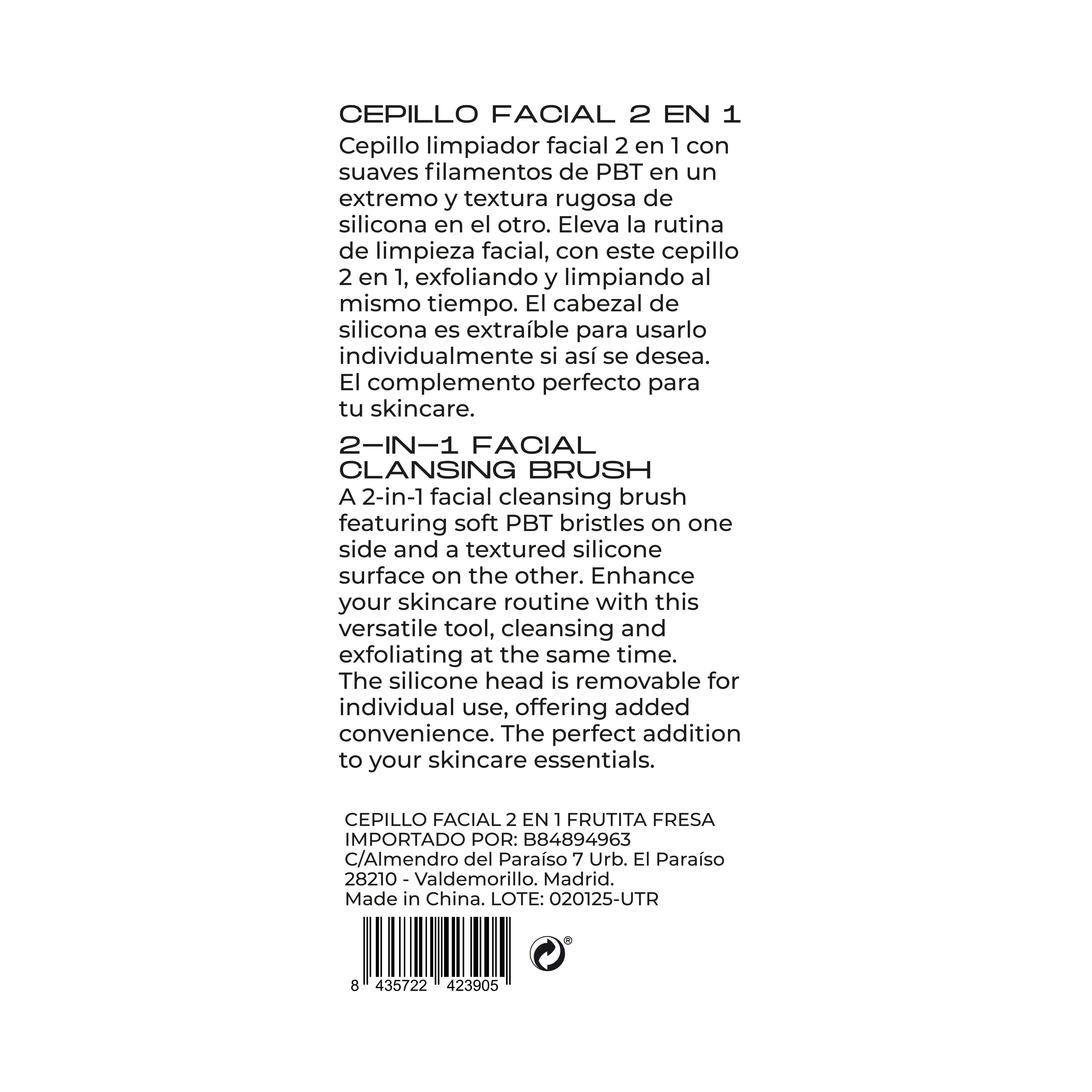 Cepillo limpiador facial 2 en 1 con suaves filamentos de PBT en un extremo y textura rugosa de silicona en el otro.