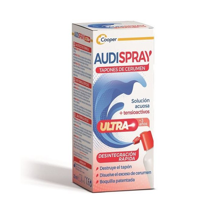 Audispray Ultra Disuelve Tapones de Cerumen es una solución acuosa para disolver tapones de cerumen que permite tratar eficazmente los tapones de cerumen ya formados o en formación. Este producto está diseñado para su uso doméstico, proporcionando un tratamiento suave y efectivo para el cuidado de los oídos.