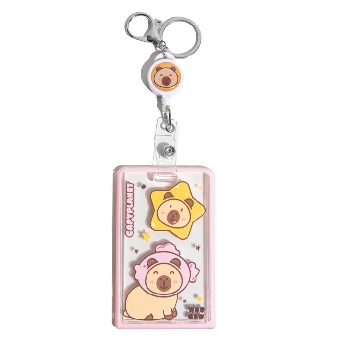 Llavero tarjetero con cable retráctil y charm capybara, compacto y práctico para llevar tus tarjetas y llaves siempre a mano.