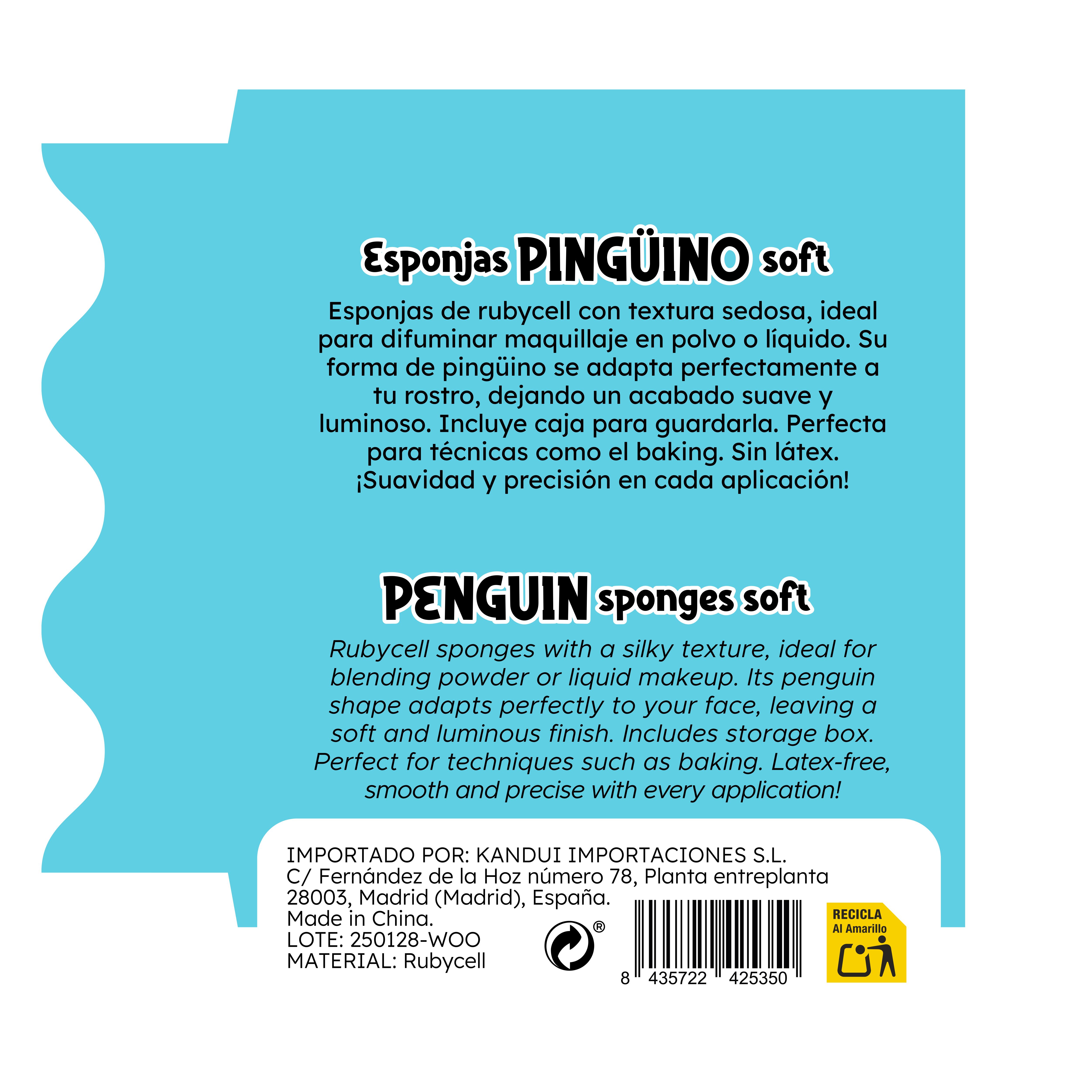 El Set 2 Esponjas Pingüino Soft está elaborado con rubycell, un material que facilita el difuminado de productos en polvo y líquidos sin absorber en exceso. La forma tipo pingüino del Set 2 Esponjas Pingüino Soft permite trabajar distintas zonas del rostro con precisión y mantener un acabado uniforme.