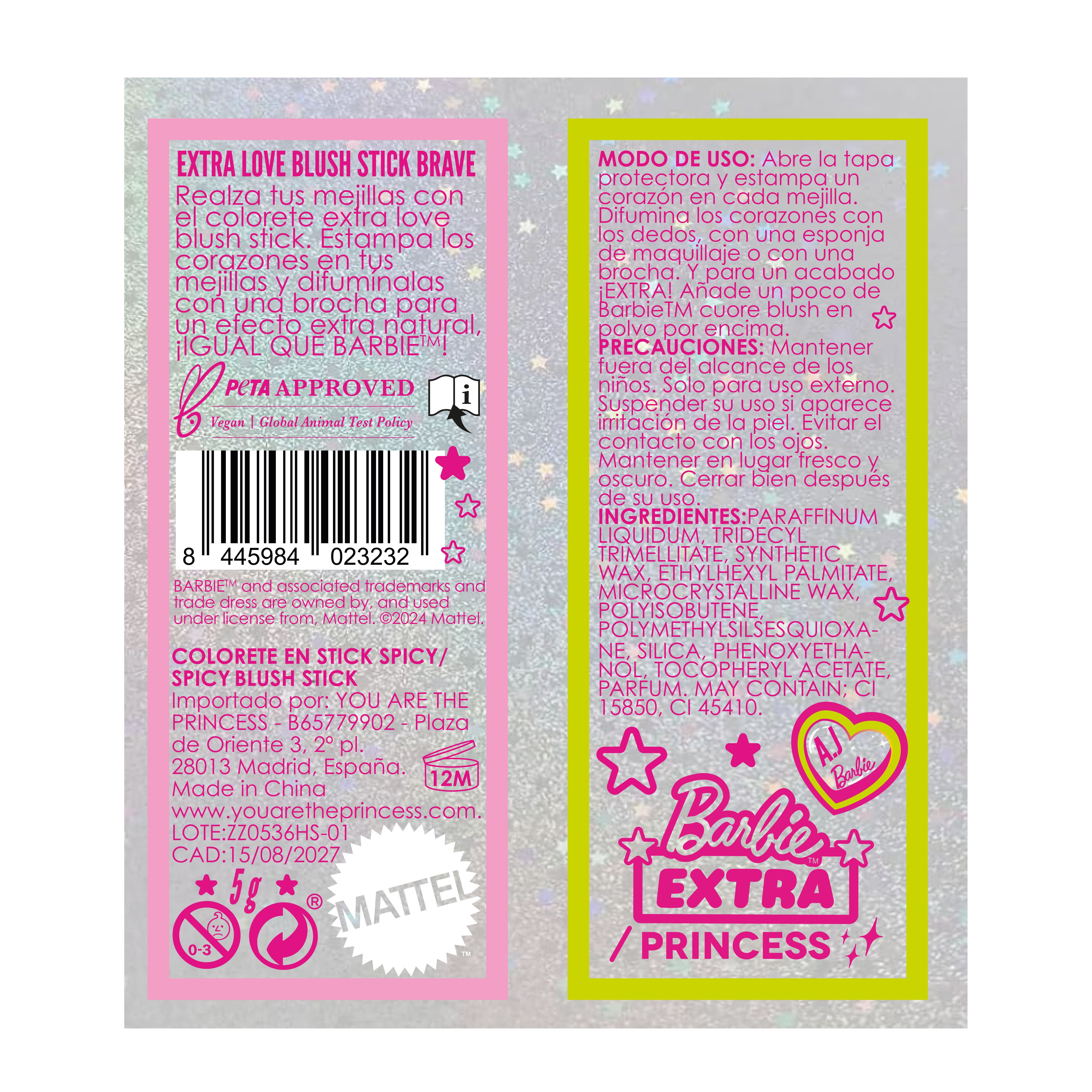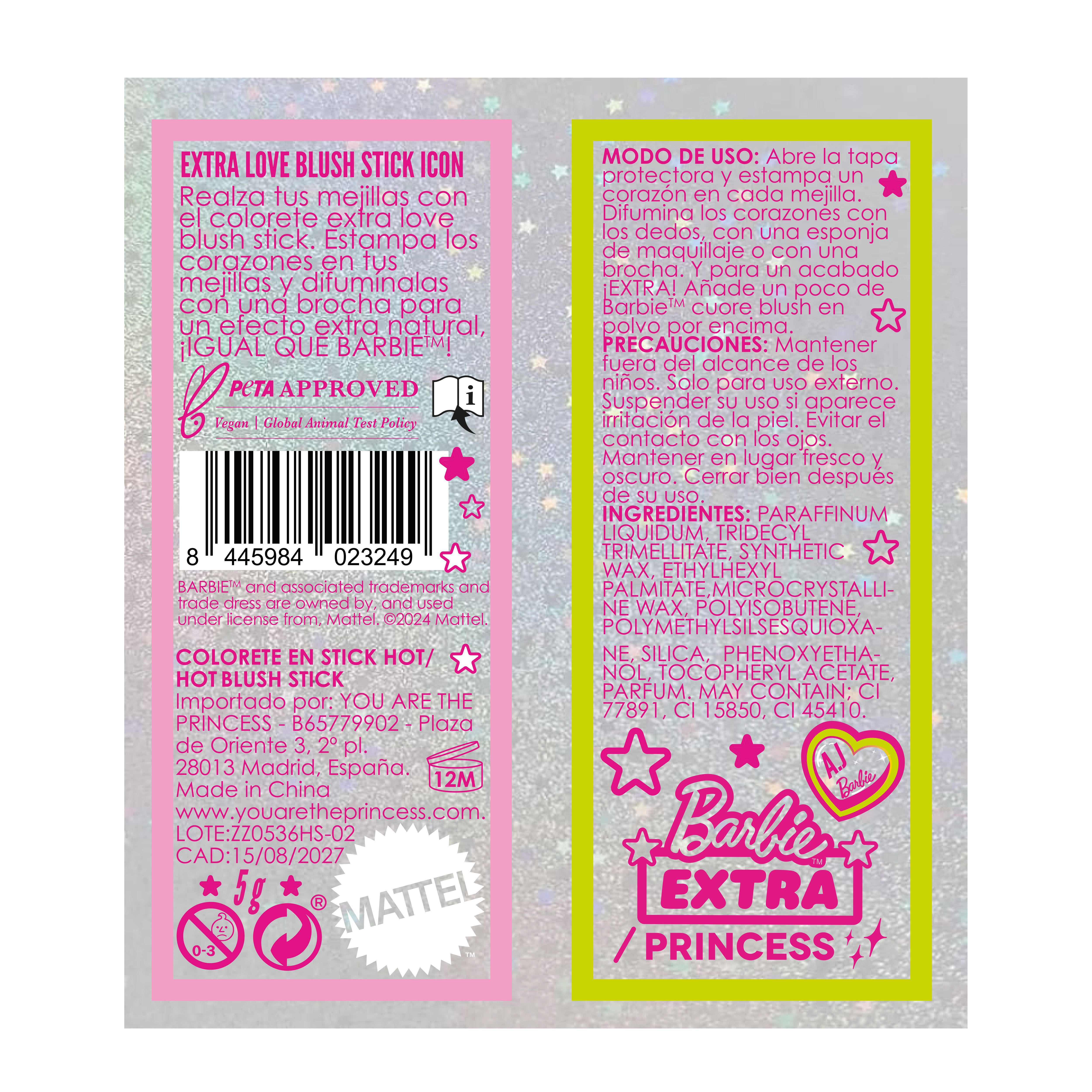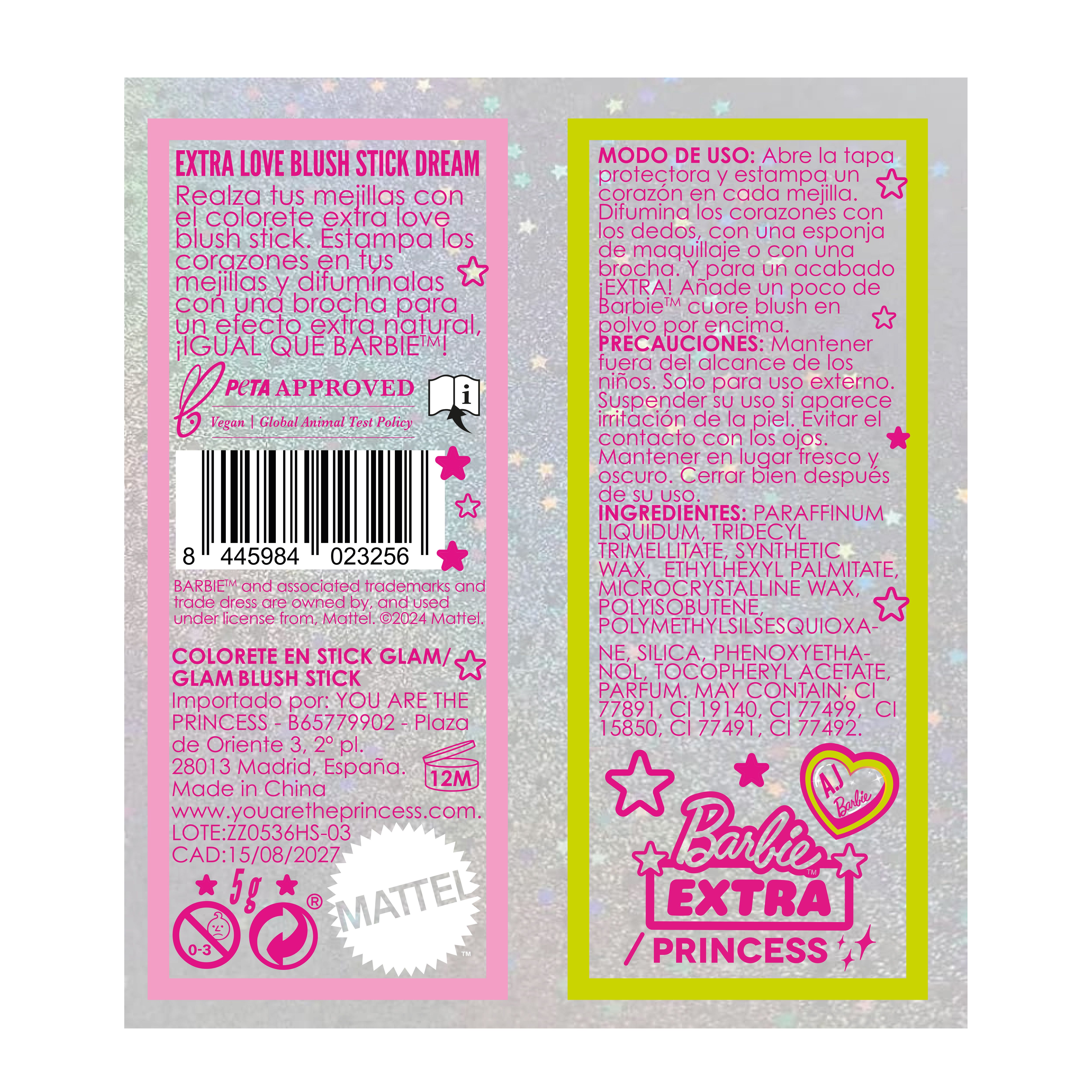 El Barbie™ / Princess Extra Love Blush Stick Colorete en Barra combina una textura cremosa y ligera que se funde con la piel, dejando un efecto natural y modulable.