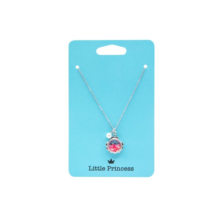 cadena plateada con charm de concha rellena de glitter rosa y charm de perla. Con este colgante serás la Princess más brillante del mar.