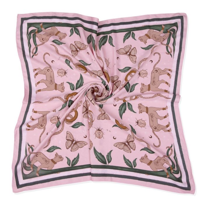 Pañuelo cuadrado rosa con estampado de fantasía. Perfecto para anudar y decorar tus peinados. Además, gracias a su tamaño, podrás utilizarlo como prenda de ropa.