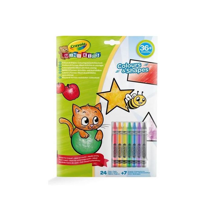 Este Libro para Colorear Formas y Colores de CRAYOLA incluye 24 páginas con dibujos variados para colorear y 7 ceras de distintos colores proporcionadas por CRAYOLA.