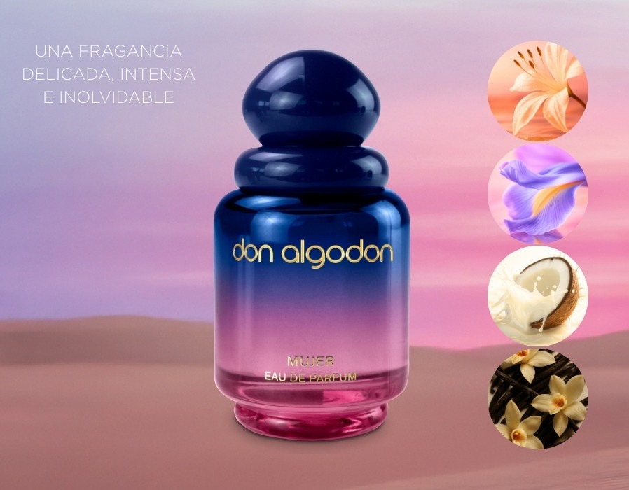 De Madrid al mundo. Las fragancias de Don Algodón persiguen la misma estética suave y fresca que sus prendas. Nacida en la calle Claudio Coello de Madrid durante la década de los 8, la marca Don Algodón siempre ha sido sinónimo de juventud. Todo un icono reconocido a nivel mundial, continuó con toda clase de complementos para el hogar e higiene personal, que más tarde pasó a las fragancias con su primer perfume en 1985 Don Algodón Eau de Toilette (EDT) para hombre y mujer. Caracterizados por un aroma que persigue una esencia juvenil y desenfadada, las colonias para hombre y mujer de Don Algodón son perfectas para perfumar suavemente tu cuerpo tras el baño. Son aromas que no se olvidan. Y si quieres potenciar tu aroma, tan solo tendrás que dejarte seducir por sus geles de baño, desodorantes y cremas corporales.