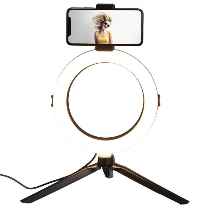 Lâmpada em forma de anel composta por um anel de 20 cm de diâmetro, composto por 72 LEDs e um tripé.