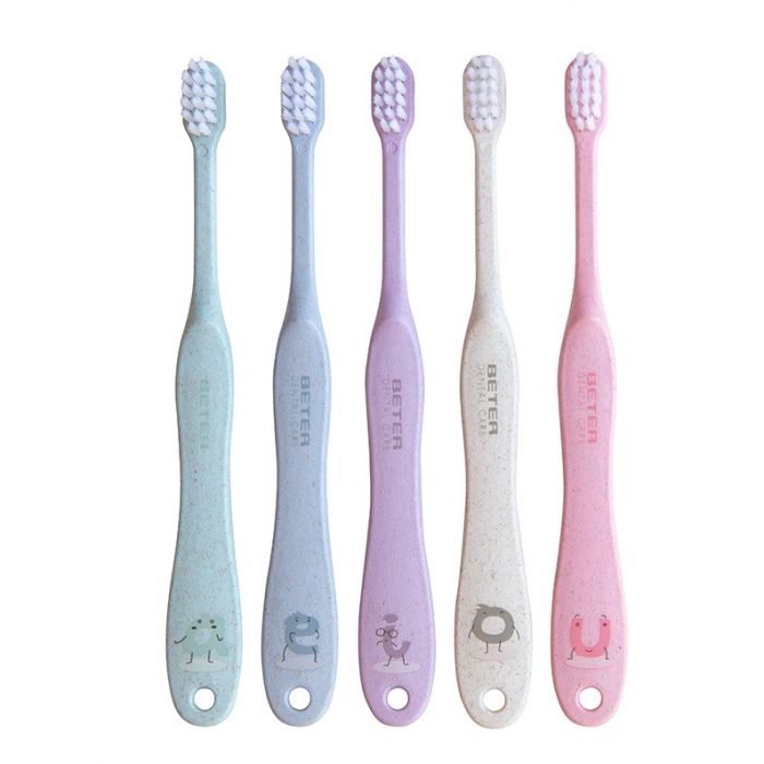 Mango feito de fibras de trigo que se adapta às mãos mais pequenas. Cabeça que permite alcançar todas as áreas da cavidade oral, cerdas extra suaves PBT para uma escovagem segura e eficaz.
