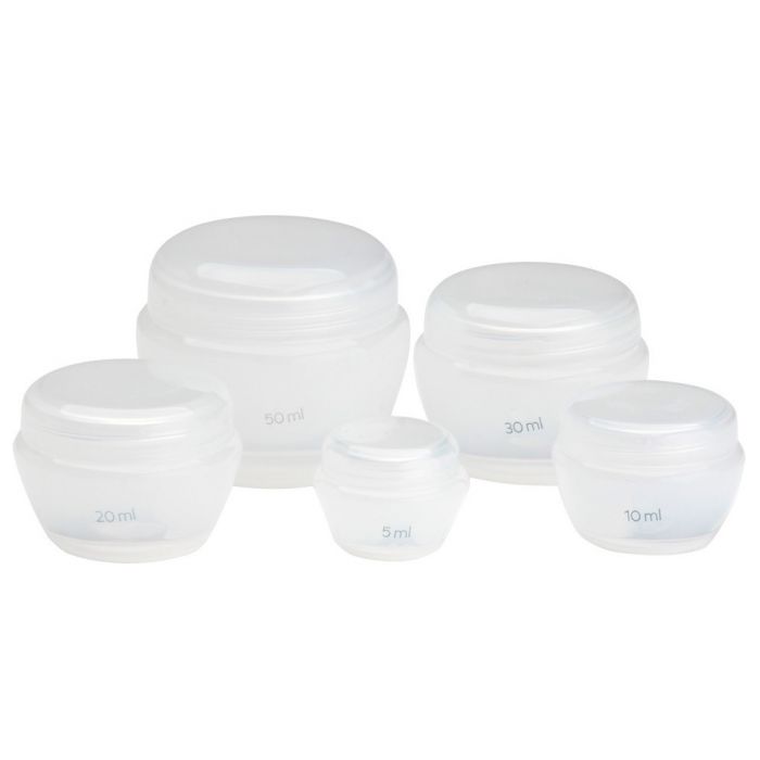 Conjunto de 5 frascos de cosméticos com tampa de rosca e tampa protetora ideal para transportar maquilhagem e cosméticos em viagem.