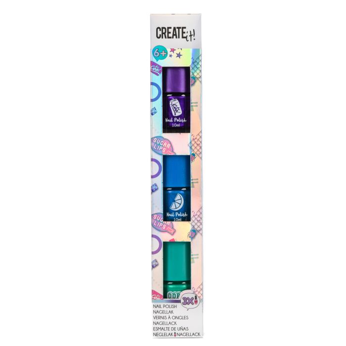 Este conjunto inclui 3 vernizes ROSA, MORADO e AZUL.