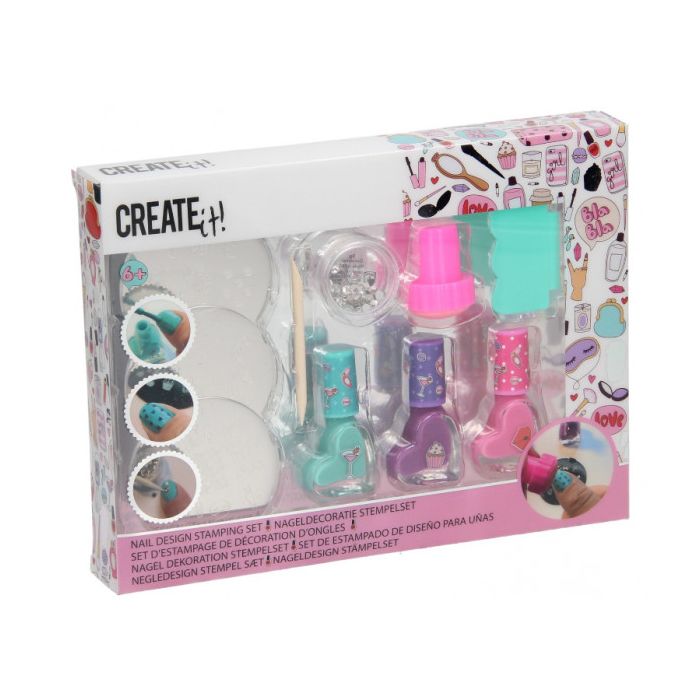 Conjunto de Create It! para os mais pequenos da casa com esmalte de unhas, selos para unhas e pequenos diamantes. Adequado para NIÑOS a partir dos 6 anos.
