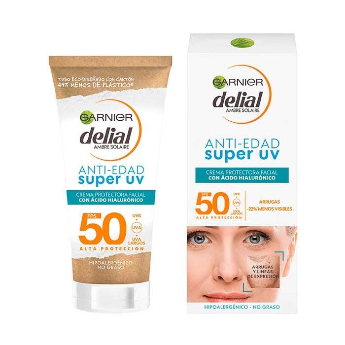 Delial Antienvelhecimento Super UV FPS 50desenvolvido para o rosto e o delicado contorno dos olhos, é formulado com ácido hialurônico que oferece alta proteção e reduz em um 22% a visibilidade das rugas e linhas de expressão.