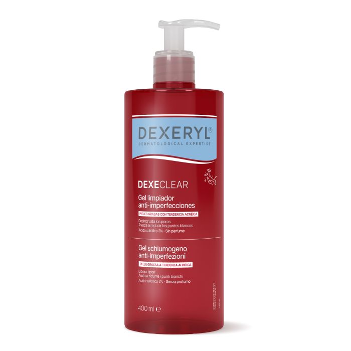 O gel de limpeza anti-imperfeições 2 em 1 DEXECLEAR limpa em profundidade e purifica as peles com tendência acneica. Graças à sua fórmula com 2% de ácido salicílico, o nosso gel desobstrui os poros e reduz o excesso de sebo em 90%* desde a primeira utilização, oferecendo um efeito refrescante.