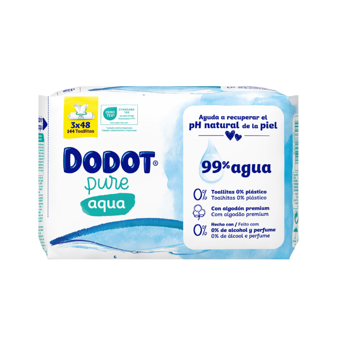 As toalhitas Dodot Cuidado Total Aqua são elaboradas com 99% de água para uma limpeza delicada da pele do teu bebé.