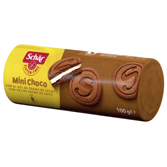 DR SCHÄR MINI SORRISI: Pequenos biscoitos de cacau com recheio de creme de leite. Este produto foi feito com matérias-primas sem glúten e sem trigo.