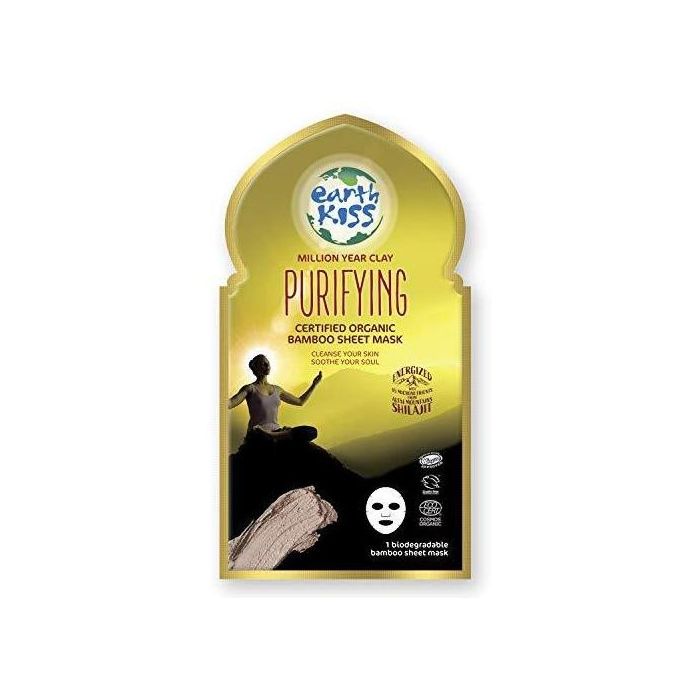 AEarth Kiss Million Year Clay Purifying Bamboo Sheet Mask é habilmente infundida com Aloé Vera para suavizar a pele, enquanto os sais do Mar Morto e Shilajit, ricos em minerais, ajudam a desobstruir os poros e a suavizar o aparecimento de rídulas.