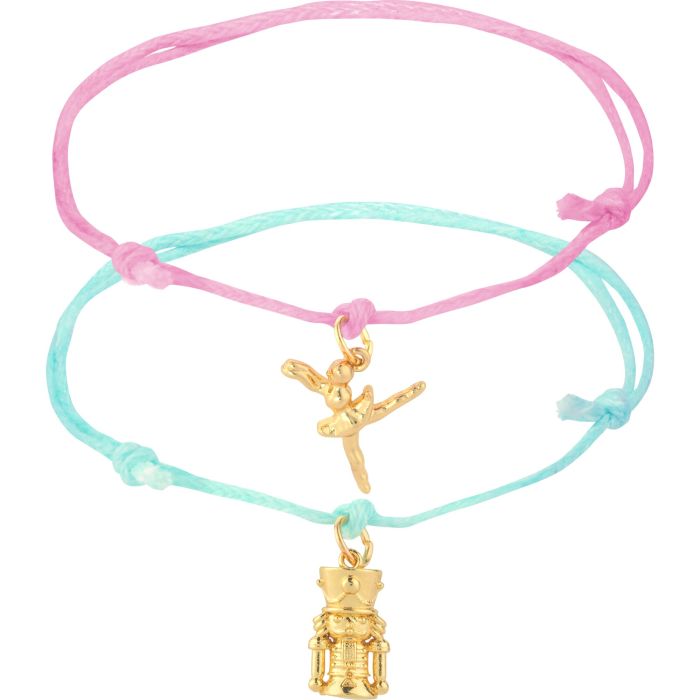 Celebrem as férias em grande estilo com o duo de pulseiras NUTS ABOUT YOU 01 The Last Dance. Este adorável conjunto inclui duas pulseiras de cordão ajustável em menta suave e rosa pálido, cada uma adornada com um delicado amuleto metálico dourado. Uma pulseira apresenta um pormenorizado pendente de um quebra-nozes, enquanto a outra mostra uma graciosa bailarina em plena dança. Estes adoráveis acessórios, que podem ser usados em conjunto ou em separado, dão um toque divertido e festivo a qualquer conjunto, sendo perfeitos para partilhar com um amigo ou para guardar para si.