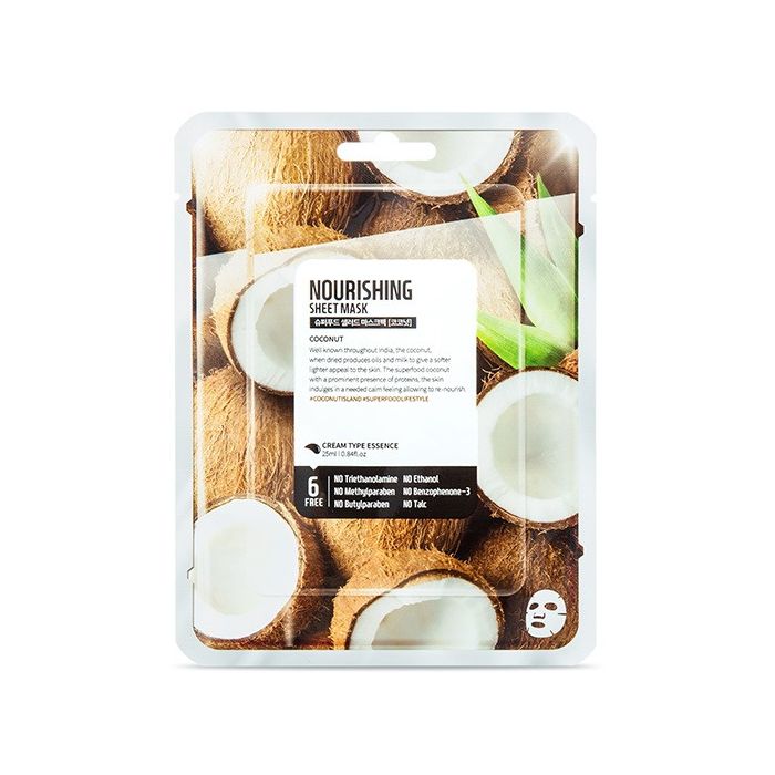 Máscara de Coco hidratante Farmskin. Uma máscara facial em formato de folha, que lhe dá a energia do óleo de coco e do leite, obtendo uma textura mais suave da pele, proporcionando muita proteína e relaxamento natural.