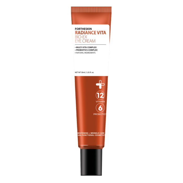 Creme para o contorno dos olhos. O creme contém um complexo de 12 tipos de vitaminas e 6 tipos de probióticos que iluminam a pele baça causada pelo stress, deixando-a mais fresca e jovem. O complexo de 12 vitaminas ajuda a melhorar a tez, a aliviar o inchaço e a reduzir as olheiras, a melhorar a condição da pele e o complexo de 6 probióticos fortalece a barreira cutânea e regula o equilíbrio do óleo e da água, mantendo a pele saudável.