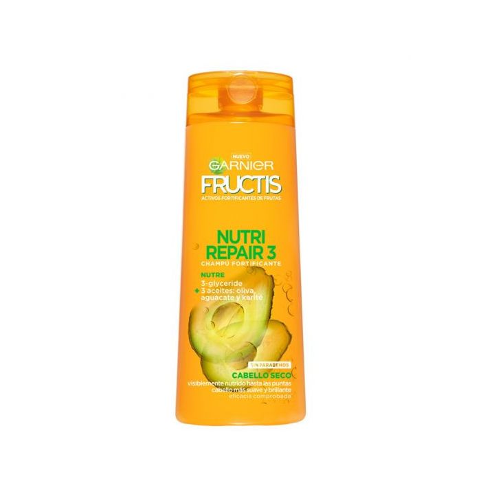 O Champô Fructis Nutri Repair 3 combina os benefícios de 3 óleos: oliva, abacate e karité com 3-glicéridos, um ativo conhecido pelas suas propriedades nutritivas, para devolver a nutrição e a suavidade ao cabelo nas suas fórmulas com activos concentrados fortificantes de frutos.
