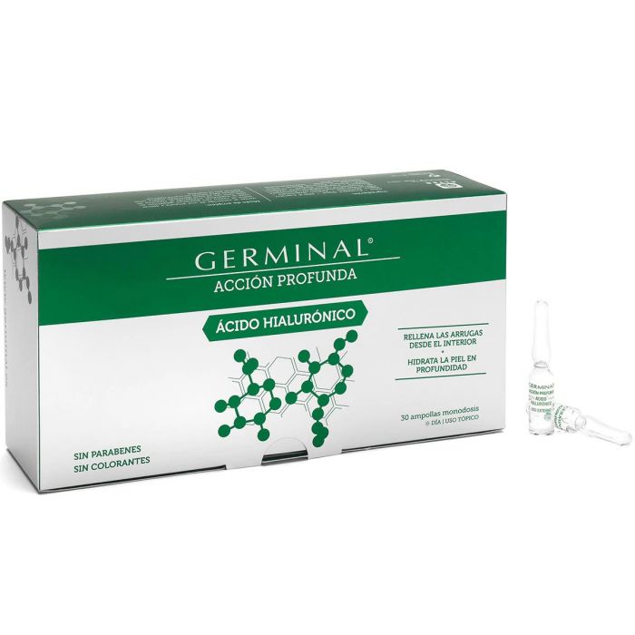 Ação de ácido hialurônico profundo de Germinal. Ele consegue borrar rugas, alcançando assim um rosto perfeitamente hidratado enquanto liso e luminoso. Você vai usar uma pele muito mais jovem.