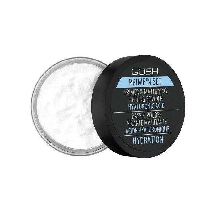 Gosh Prime'n Set Hyaluronic Acid Powder - Pó incolor microfino com ácido hialurónico que pode ser utilizado como primer ou sozinho como pó matificante. É suave e cria um acabamento matte perfeito e um resultado uniforme. A combinação de microesferas de ácido hialurónico e de sílica superabsorvente ajuda a reduzir as rugas, as rídulas e os poros visíveis, dando à pele uma suavidade extrema.
