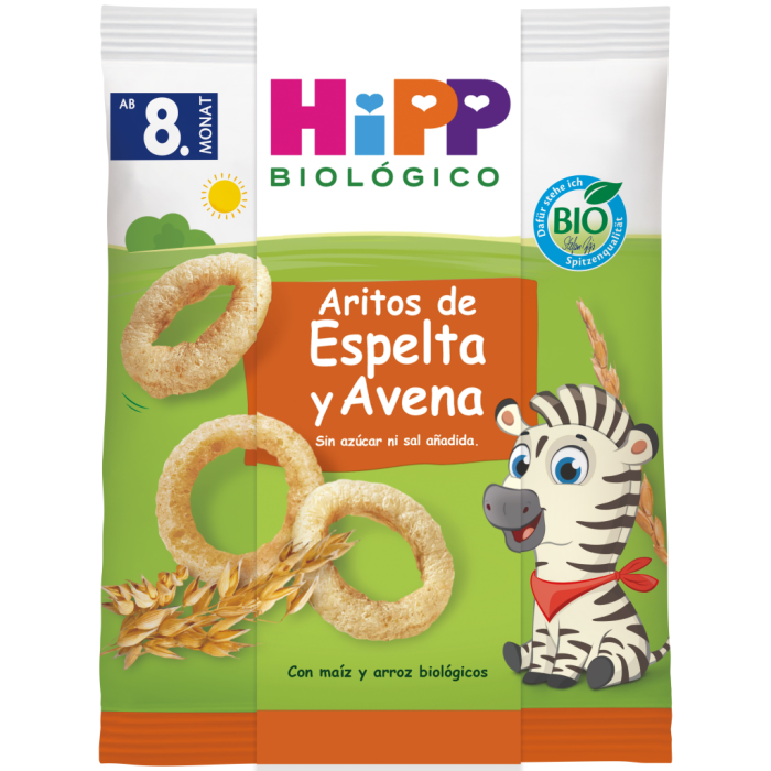 Aritos de espelta e aveia bio para bebés e NIÑOS a partir dos 8 meses de idade. Ideais para petiscar entre as refeições quando começam a aparecer os dentes.