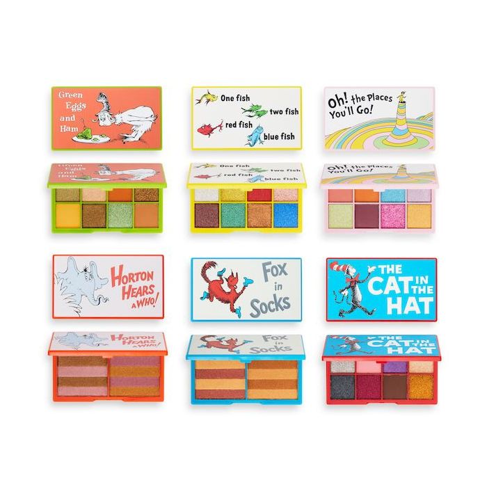 A coleção de paletas i heart revolution Dr. Seuss inclui todas as 6 paletas numa caixa colecionável ao estilo de um livro de histórias. Inclui 4 paletas de sombras deslumbrantes e 2 paletas de rosto - tudo o que precisa para tornar a sua maquilhagem completa e variada!