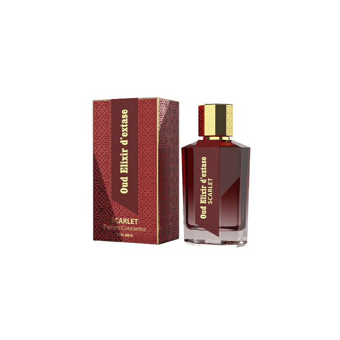 Oud Elixir d’Extase Scarlet: uma viagem olfativa onde a frescura inicial se funde com uma intensidade sedutora.