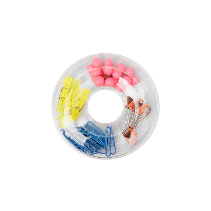 Estojo TRANSPARENTE com compartimentos separados que inclui 49 peças com diferentes acessórios de papelaria.