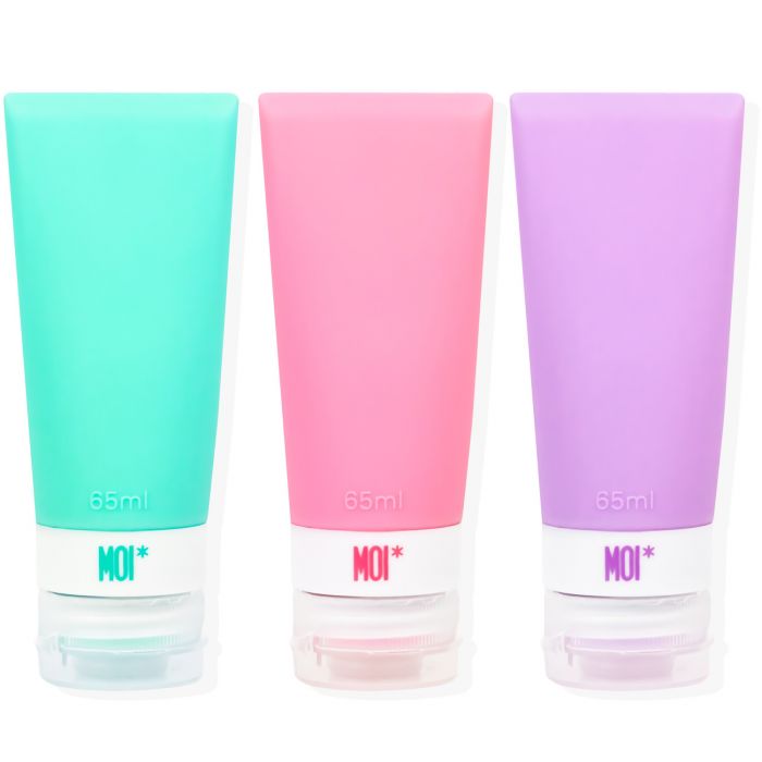 Conjunto 3 Frascos de Viagem MOI*: Conjunto de 3 frascos de silicone recarregáveis de 65 ml com tampa de rosca e sistema anti-vazamento. Você pode preenchê-los com seus cosméticos, produtos líquidos e cremosos favoritos e transportá-los com total segurança.