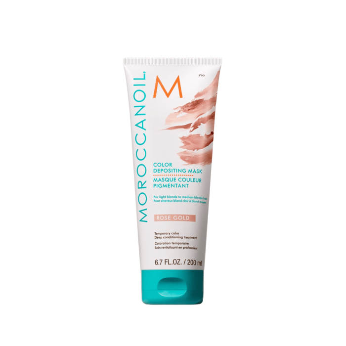 A máscara moroccanoil Rose Gold Colour Mask adiciona uma cor temporária concebida para se desvanecer gradualmente com o tempo.