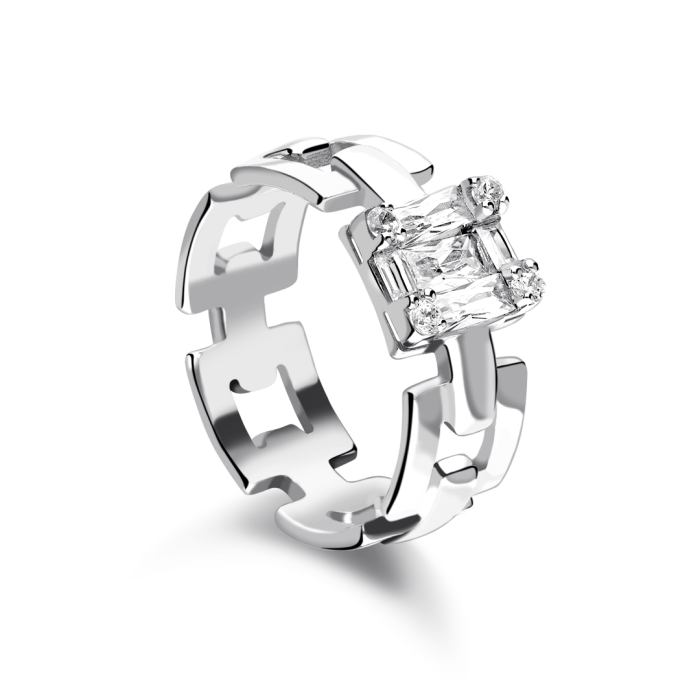 O Design Nessari Alaska Ring, elaborado em prata de lei, apresenta uma deslumbrante pedra baguete no centro de uma estrutura composta pelos icónicos elos quadrados da marca.