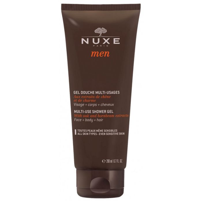 Gel de Ducha Masculino Multiusos da Nuxe é um gel para corpo, rosto e cabelo que não contém sabão para respeitar ao máximo a pele sem ressecá-la.