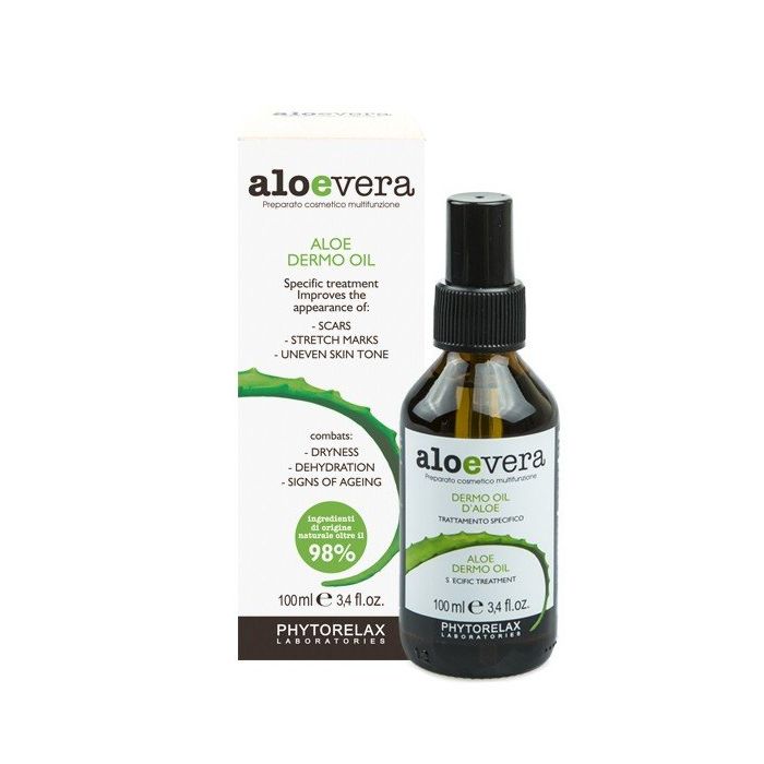 PHYTORELAX ALOE VERA DERMO OIL: Óleo dermo-cosmético de rápida absorção. Phytorelax Dermo Oil d'Aloe pode ser utilizado no rosto e no corpo. Utilizado regularmente, este óleo de aloé melhora o aspeto da pele em caso de cicatrizes, marcas, estrias, secura, desidratação.