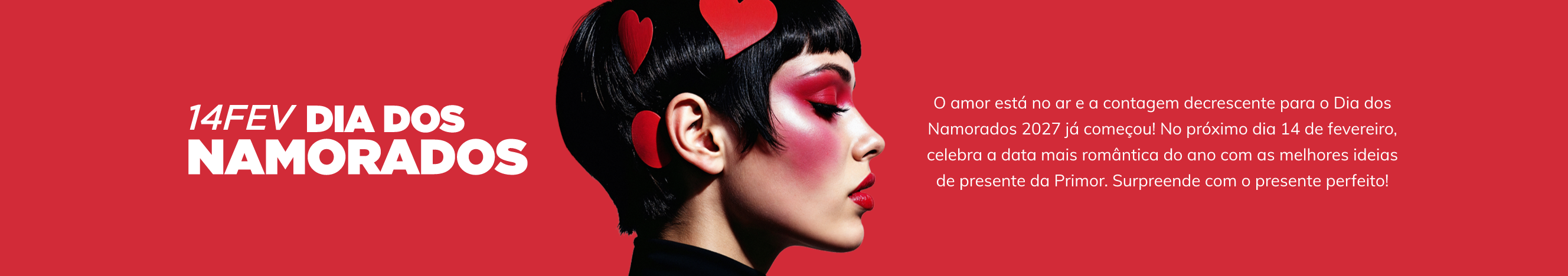 O Dia dos Namorados, também conhecido como o Dia de São Valentim, celebra-se a 14 de fevereiro de cada ano. Em 2027, calha a um domingo, o cenário ideal para um plano especial e uma surpresa romântica. Para que não te faltem ideias nem inspiração, na Primor encontras as melhores promoções em presentes para o Dia dos Namorados. Porque mostrar o teu amor não tem preço.