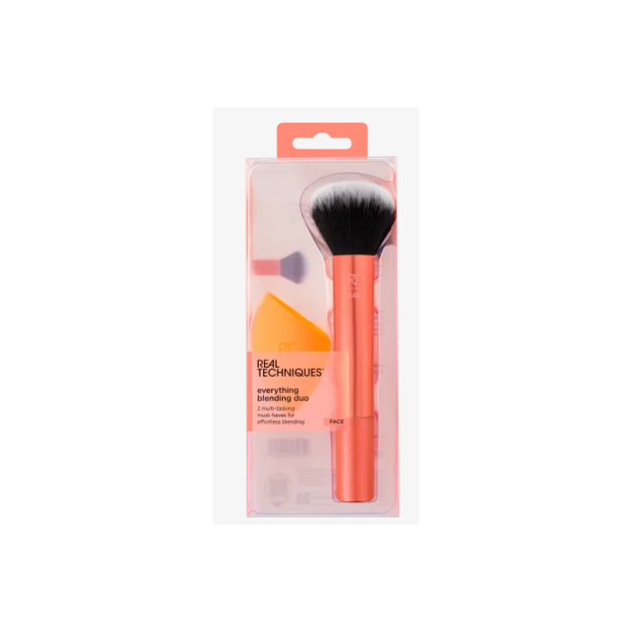 O conjunto Everything Blending Duo da Real Techniques inclui duas ferramentas multiusos para uma aplicação de maquilhagem impecável. O conjunto inclui o pincel facial 245 Everything Facial Brush e a esponja Miracle Complexion Sponge. O pincel para o rosto tem uma cabeça grande para esbater facilmente bases líquidas, em creme e em pó, garantindo um brilho natural - pode ser usado para maquilhagem, pó, blush, bronzer e muito mais! A esponja de maquilhagem oferece um aspeto natural e radiante com uma cobertura ligeira a média. Possui uma técnica de aplicação única de 3 pontos para uma aplicação perfeita.