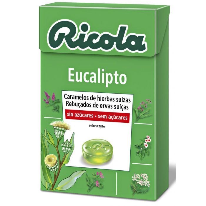 EUCALIPTO RICOLA : Doces de eucalipto, para uma garganta saudável. O responsável é o alto teor de cineol das folhas de eucalipto, um óleo essencial com efeitos expectórios e refrescantes. Para suas propriedades, o eucalipto é um remédio natural eficaz para tosse, resfriados e resfriados. Em nossos doces de eucalipto, os efeitos do eucalipto e do mentolão são unidos aos da mistura comprovada de 13 ervas.