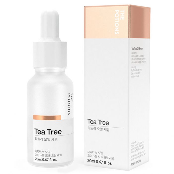 The Potions Serum Tee Tree Oil Serum cuida manchas geradas pela acne. O óleo da árvore do chá resolve problemas de pele em pouco tempo. Ajuda a controlar a secreção excesso de sebo, reduz o aparecimento de poros e acalma e hidrata o pele irritada causada por agressões externas.