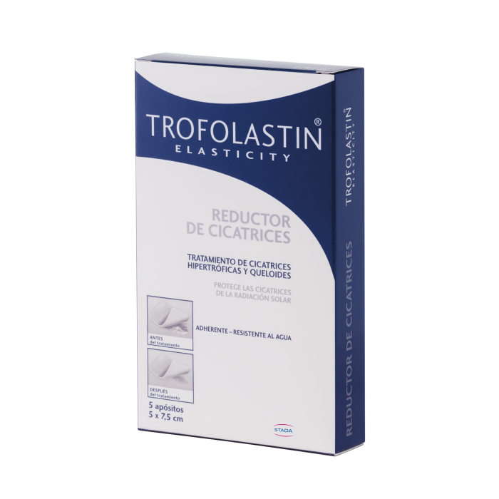 Redutor de cicatrizes Trofolastin ajudará a disfarçar e reduzir suas cicatrizes hipertróficas ou queloides. Você pode usá-lo independentemente de serem novos ou velhos, desde que estejam completamente fechados. Formado por duas camadas, a interna que se prende à pele e causa um arranjo correto de fibras de colágeno, e a externa que é impermeável, respirável e protege do sol impedindo que a pele seja piggmented e deixe uma marca.
