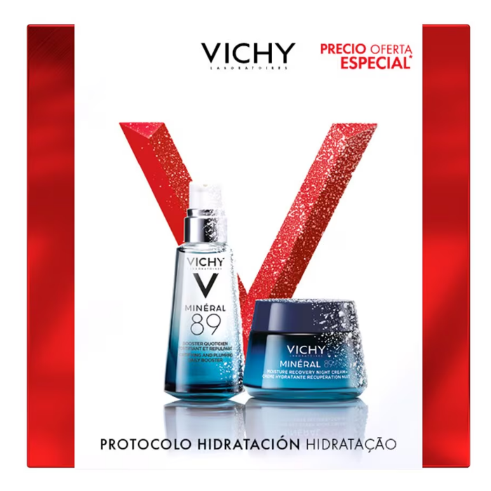 Coffret Minéral 89 da VICHY com protocolo completo de hidratação para dia e noite. Inclui o Sérum Minéral 89, que fortalece e reforça a barreira da pele, e o Creme de Noite Minéral 89, que hidrata e ajuda na regeneração durante a noite. Concebido para proteger, hidratar e revitalizar a pele do rosto, pescoço e contorno dos olhos como parte da rotina diária de cuidados faciais.