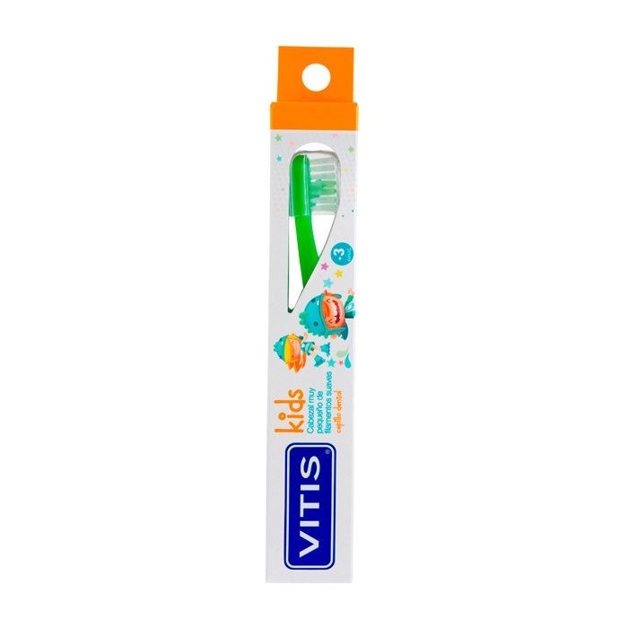 escova de dentes Vitis Kids projetado para crianças com mais de três anos de idade. Com filamentos Tynex macios e de alta qualidade que fornecerão ao seu filho uma higiene bucal ideal de forma simples. Protege a boca com a limpeza adequada evitando assim o aparecimento de doenças e cáries bucais.