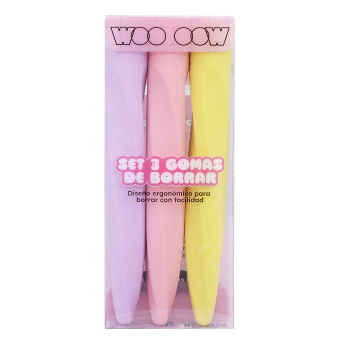 Este conjunto de 3 borrachas com forma de "marcador" é perfeito para o regresso às aulas ou para o escritório. Graças ao seu design ergonómico, facilitam o apagamento e são super confortáveis de usar.