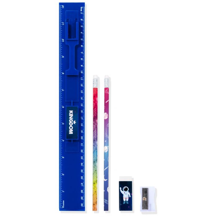Conjunto que inclui 2 lápis, 1 borracha, 1 apontador e 1 régua de 130cm.