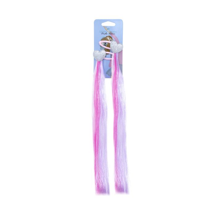 Conjunto de dois clipes com decoração em CORAZÓN glitter com uma madeixa de pelo sintético nas cores rosadas com um comprimento de 38 cm.