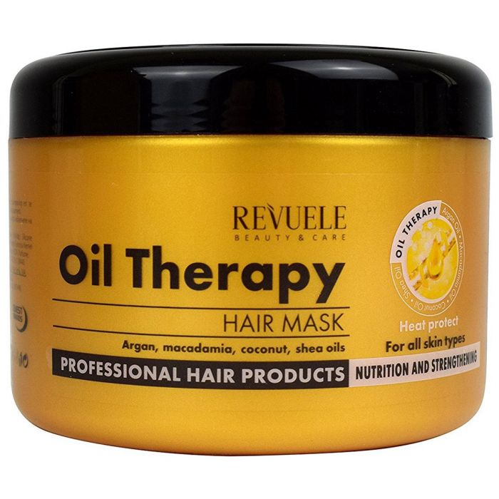 Oil Therapy Mascarilla Capilar de Revuele: Es una mascarilla capilar formulada con aceite de Argán, aceite de Macadamia, aceite de Coco y Manteca de Karité para darle a tu cabello el cuidado que necesita.